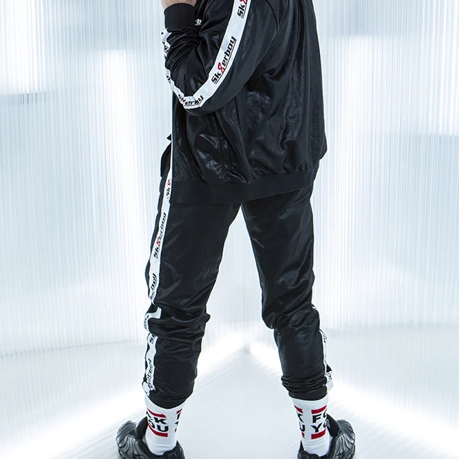 Sk8erboy long trousers by German brand Sk8erboy made of thick shiny fabric. Soft fabric on the inside with a pleasant feel. Waistband with elastic band and additional drawstring. White stripes with logo sewn onto sides. Side and back pockets with zips. Leg ends with drawstring.
