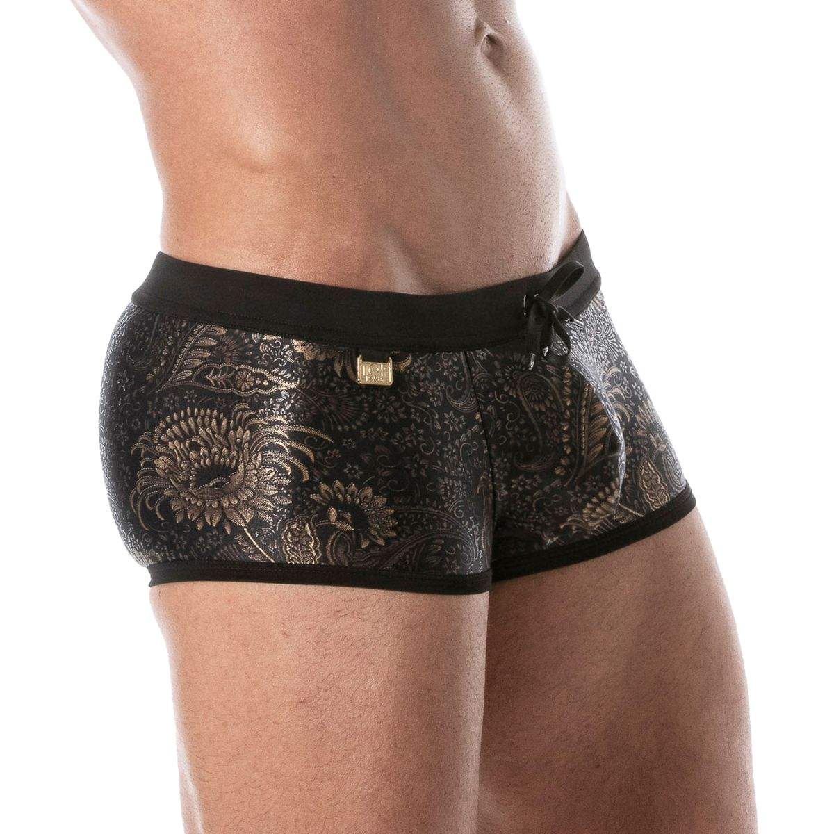 Exclusive swim trunks from the French brand TOF Paris. Black fabric with gold pattern. Convenient front pocket. Waistband with a sewn-in elastic band and an added drawstring.
